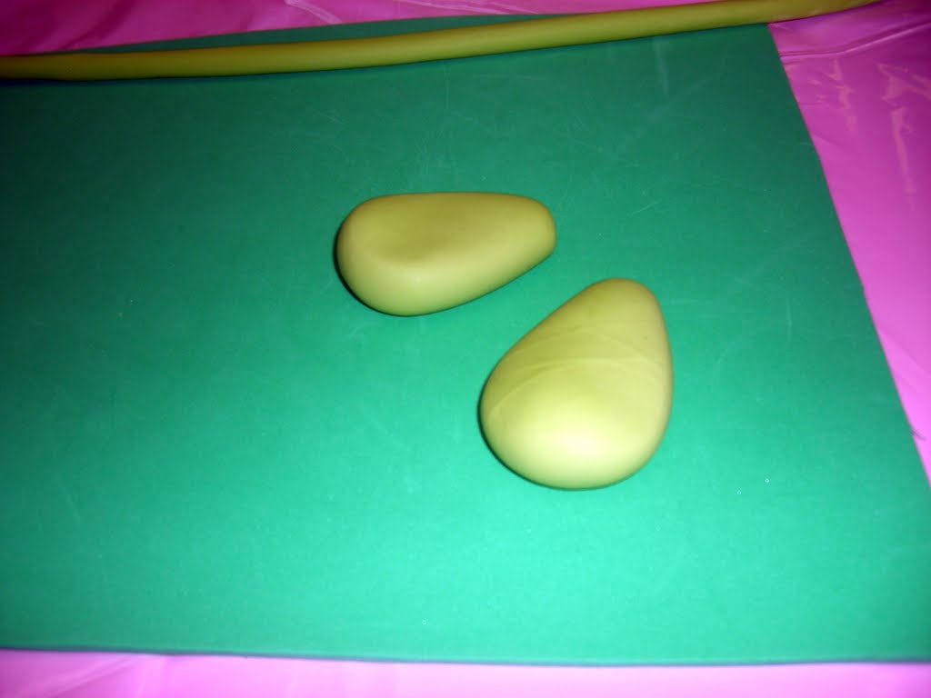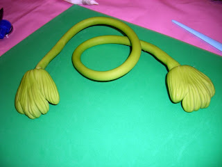 Para as mãos fazem- se duas bolas com o biscuit verde , achatam-se e afunilam-se numa das extremidades.