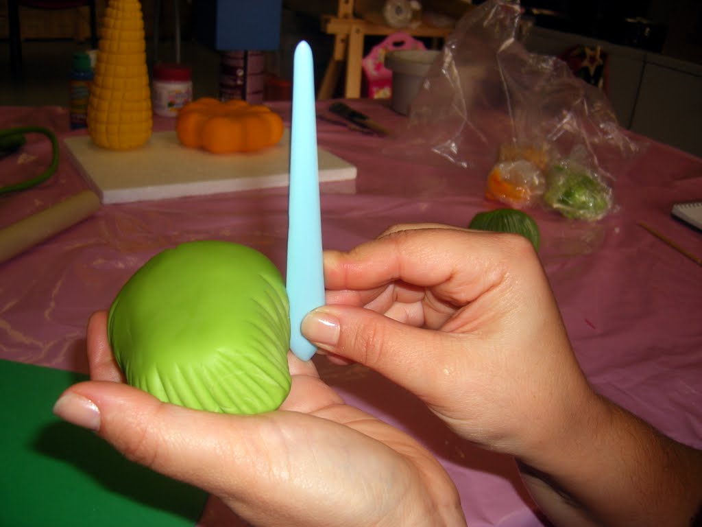 Forra-se metade de uma bola de esferovite com biscuit verde, com a ajuda da palma da mão, afunila-se um pouco numa das extremidades, fazendo a peça rodar. Com a ajuda de um teque fazem-se uns cortes irregulares a toda a volta do pé.