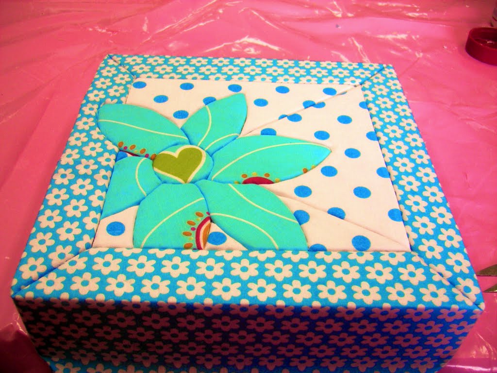Na parte de baixo do tampo da caixa colamos o excesso de tecido para dentro ou então podemos corta-lo, sendo que desta forma temos que pincelar as beiras do tecido com termolina leitosa antes de o cortarmos, para desta forma não desfiar.