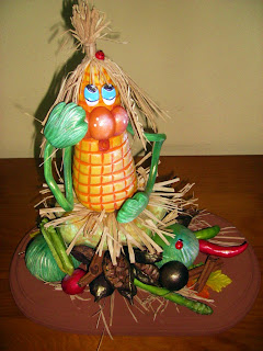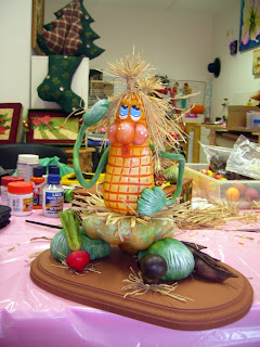 Tudo isto feito procede-se à montagem e decoração da peça. A batata vai servir como apoio na parte de trás, por baixo da abóbora.