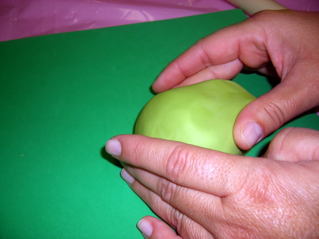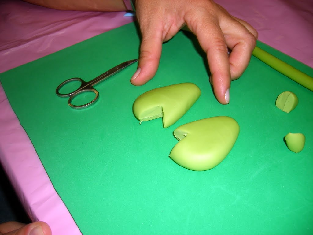 Para as mãos fazem- se duas bolas com o biscuit verde , achatam-se e afunilam-se numa das extremidades.