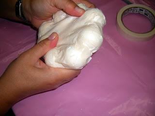 De seguida estica-se e alisa-se a massa, e com ela reveste-se a peça de esferovite tendo sempre o cuidado de a alisar muito bem e não deixar marcas nem bolhas no seu interior.